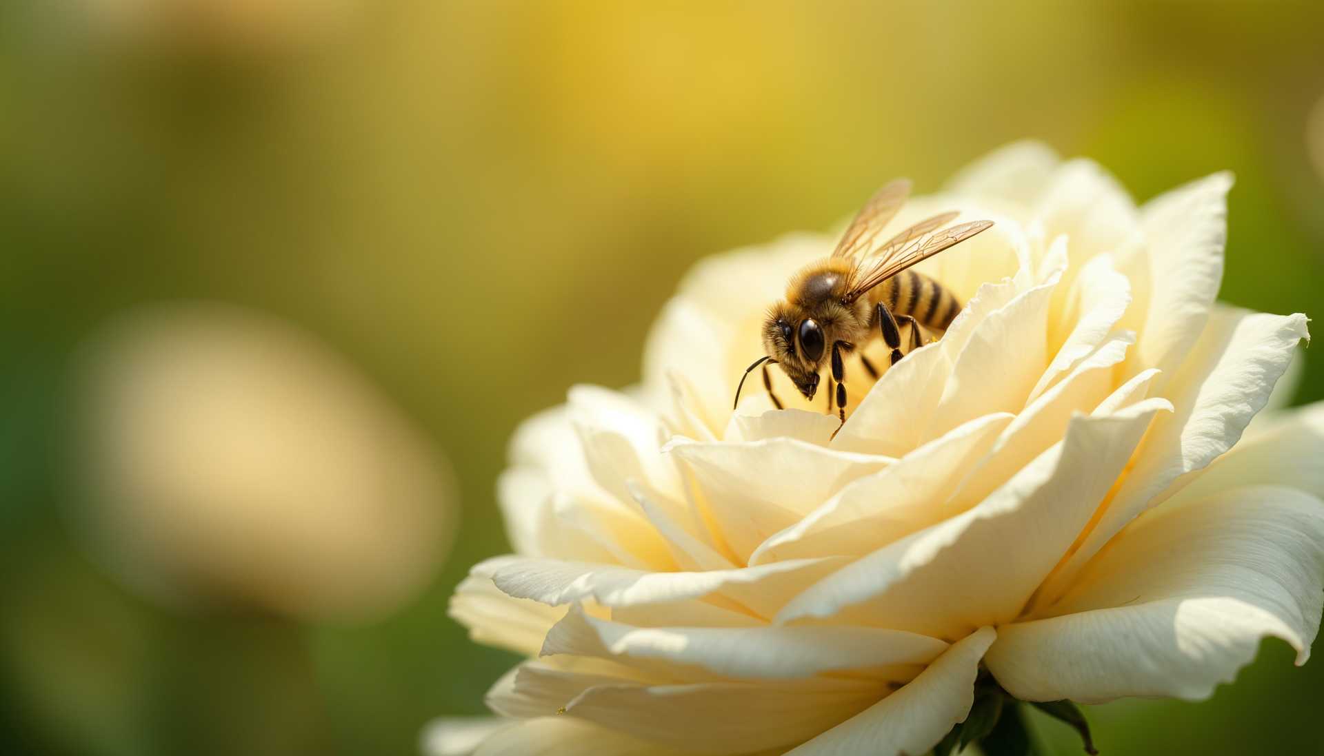 The image captures a close-up of a honeybee perched on the petals of a white rose. The bee, with its body coated in fine pollen particles, is in sharp focus against the blurred background, which consists of a soft bokeh of green and yellow hues, likely indicating a garden setting with sunlight filtering through the foliage. The bee's wings are slightly translucent and folded close to its body, a common resting position for bees. Its eyes are prominent and dark, and its long, thin proboscis is extended, perhaps in search of nectar or pollen. The white rose is in full bloom, with multiple layers of petals radiating outward, each layer slightly overlapping the one before. The petals are pristine and unmarred, suggesting the rose is either newly opened or meticulously maintained. The interplay of light and shadow across the bee and flower creates a sense of depth and dimensionality in the image. The play of light on the bee's body and the translucent petals of the rose adds a subtle shimmer, making the scene appear almost ethereal. The contrast between the sharp details of the bee and the soft focus of the background draws the viewer's eye directly to the subject, emphasizing the symbiotic relationship between the bee and the flower. Overall, the image is interesting for its natural beauty, the intricate details of the bee and flower, and the serene, almost meditative quality it evokes. It's a snapshot of nature's quiet busyness, where the hustle of pollination is captured in a moment of stillness.