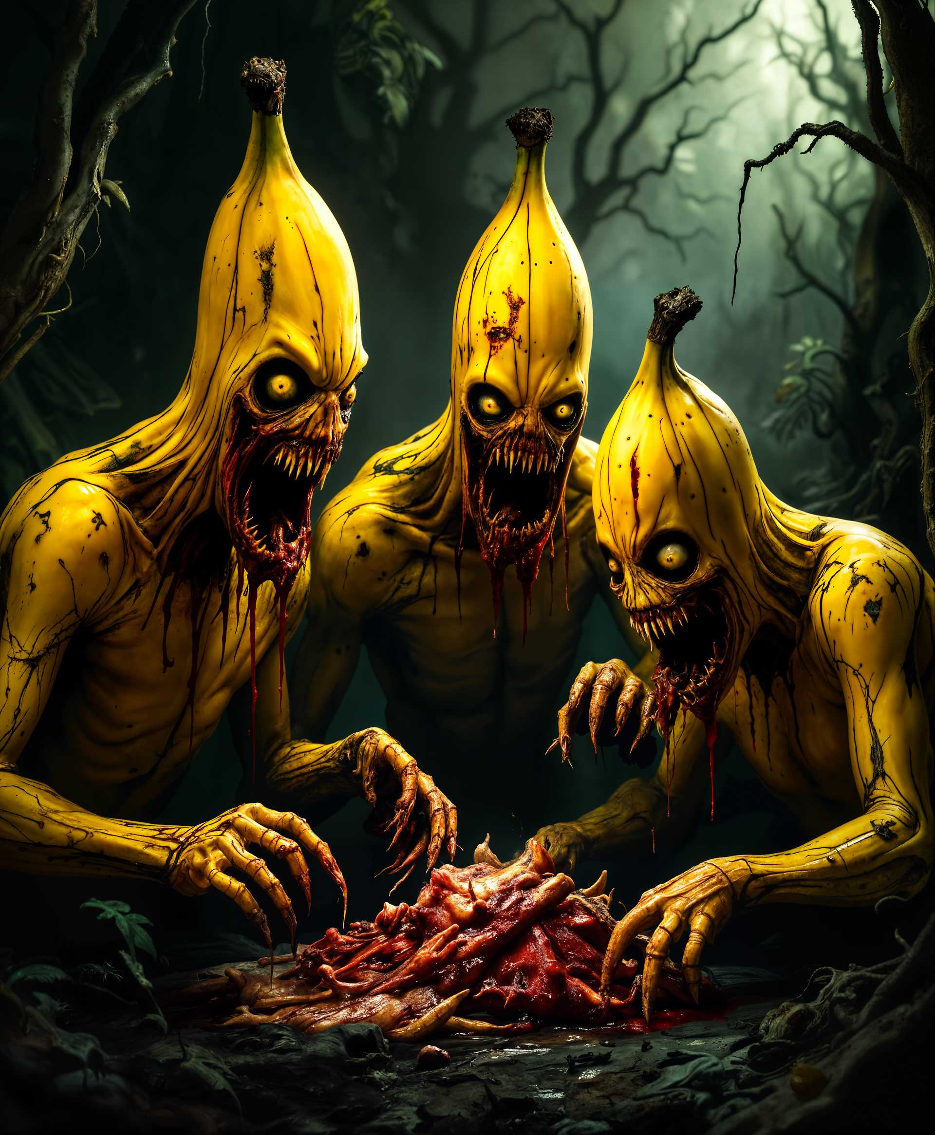 - masterpiece, best quality, highres, sharp image, more detail, masterpiece, best quality, highres, sharp image, more detail, A surreal and grotesque scene depicting a group of anthropomorphic bananas, their skins mottled with dark spots and oozing a sickly sweet liquid, in a dimly lit, decaying jungle setting. Their faces, twisted in hunger and madness, are a nightmarish blend of human and banana features, eyes wide and mouths gaping, revealing jagged, human-like teeth. The bananas are actively feasting on raw, bloody flesh, their hands and lower bodies still resembling bananas, but with hints of sinewy muscle and bone visible beneath the peeling skin. The lighting is harsh and dramatic, with stark contrasts between deep shadows and the bright, almost glowing yellows and browns of the banana people, creating a chiaroscuro effect. The background hints at a once lush rainforest now turned into a scene of horror, with twisted, leafless trees, and a heavy, oppressive atmosphere, reminiscent of a storm brewing or the aftermath of a natural disaster. The style should evoke the unsettling, visceral horror of H.R. Giger's biomechanical art mixed with the grotesque exaggeration of Hieronymus Bosch's paintings, emphasizing the surreal and the macabre.