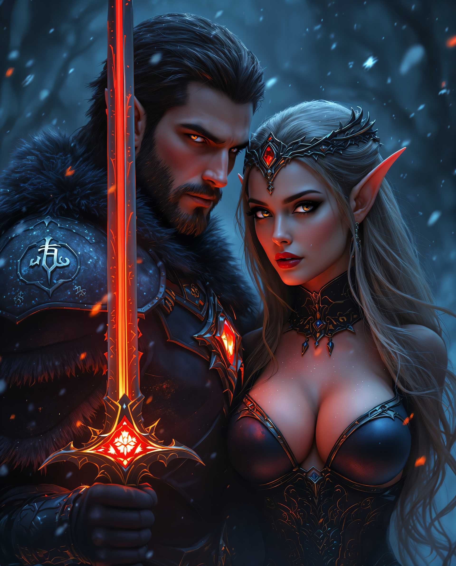 - masterpiece, best quality, highres, sharp image, more detail <lora:more_details:0.5> <lora:SDXLrender_v2.0:1>, This image is a realistic photo (photograph) of a female real person digital artwork that exudes a realism and gothic atmosphere. The art style is highly stylized with a cinematic quality, utilizing dramatic lighting and shadow to create a sense of depth and movement. The medium appears to be a digital painting, given the smooth gradients and seamless blending of colors.The colors in the image are rich and moody, with a predominance of blues and purples that give off a cold, wintry feel. There are also vibrant reds and oranges that provide a stark contrast, adding warmth and a touch of danger to the scene. The interplay of these colors creates a sense of otherworldliness and tension.The objects in the image are intricate and detailed, suggesting a high level of craftsmanship. The central figure is a male warrior, clad in dark, textured armor with fur trim, giving him a formidable appearance. His armor is adorned with glowing runes and symbols, indicating a magical or enchanted quality. He wields a sword with a red gemstone at its center, which seems to emit a faint light.To his side stands a female figure, her attire and armor equally elaborate. She has long, flowing hair and pointed ears, characteristic of an elf. Her armor is sleek and metallic, with a high neckline and a lowcut bodice, revealing her shoulders and chest. She wears a headpiece with a crownlike design, and her armor is also embellished with glowing runes and symbols.Both characters are set against a backdrop of a dark, snowy landscape, with falling snowflakes adding to the wintry atmosphere. The overall composition of the image is dynamic, with the characters positioned in a way that suggests motion and readiness for battle. The lighting and shadow play across their faces and armor, highlighting the textures and contours of their forms.The image is imbued with a sense of fantasy and adventure, as well as a touch of romance between the two characters. The detailed costumes and weapons, along with the moody color palette and dramatic lighting, contribute to the overall mood of the artwork.