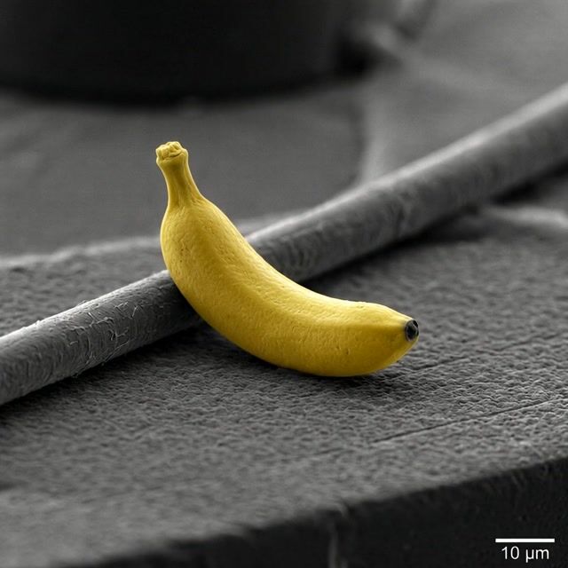 - A macro close-up shot of a tiny yellow nano banana curved with stem upright, lying diagonally across a textured gray fibrous surface with thin rods nearby and a 10 μm scale bar, captured in high-contrast electron microscope style with grayscale tones and isolated vibrant yellow on the fruit. The banana starts minuscule then steadily grows enormously larger, swelling and elongating as the camera slowly dollies back for scale, foreground fibers shifting subtly slower than the receding background surface, building tension until it massively explodes outward, peel rupturing dynamically to burst beyond the confined microscopic environment. Sharp depth of field emphasizes peeling details against the rough gray texture under neutral, stark lighting.